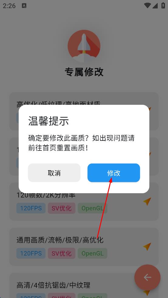 4、在溫馨提示彈窗中點(diǎn)擊修改,完成專屬修改畫質(zhì)操作。