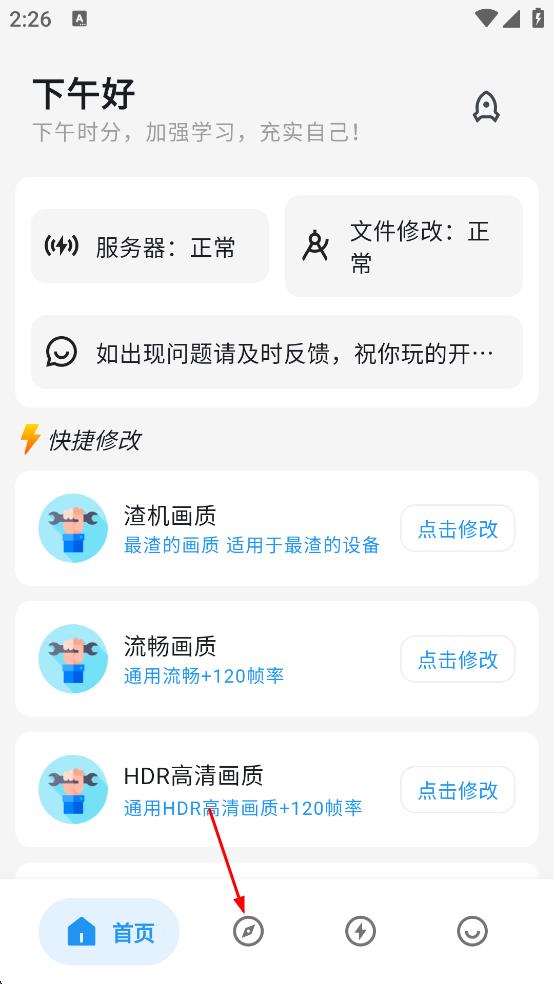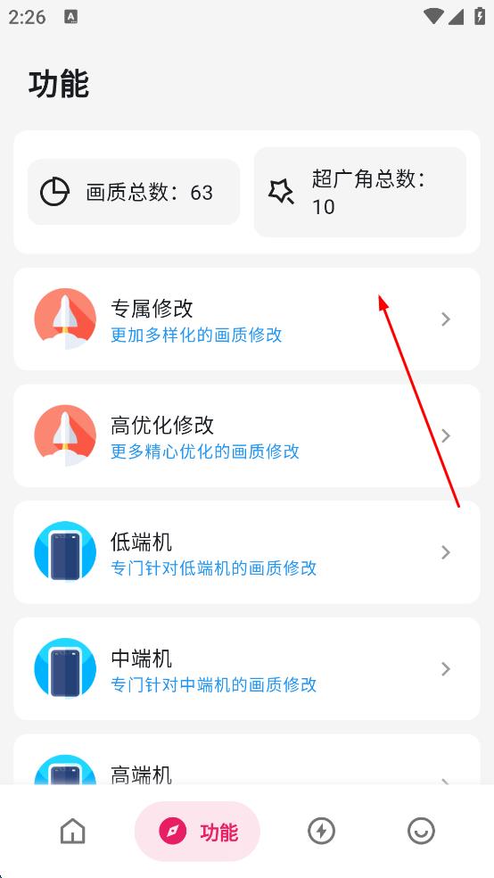 1、打開畫質(zhì)修改APP,在首頁(yè)點(diǎn)擊下方功能按鈕。
