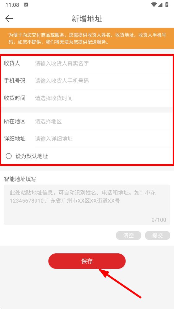 4、在新增地址頁(yè)面,依次填寫(xiě)收貨人姓名、手機(jī)號(hào)碼、收貨時(shí)間、所在地區(qū)、詳細(xì)地址等信息,點(diǎn)擊保存,即可完成地址信息添加。
