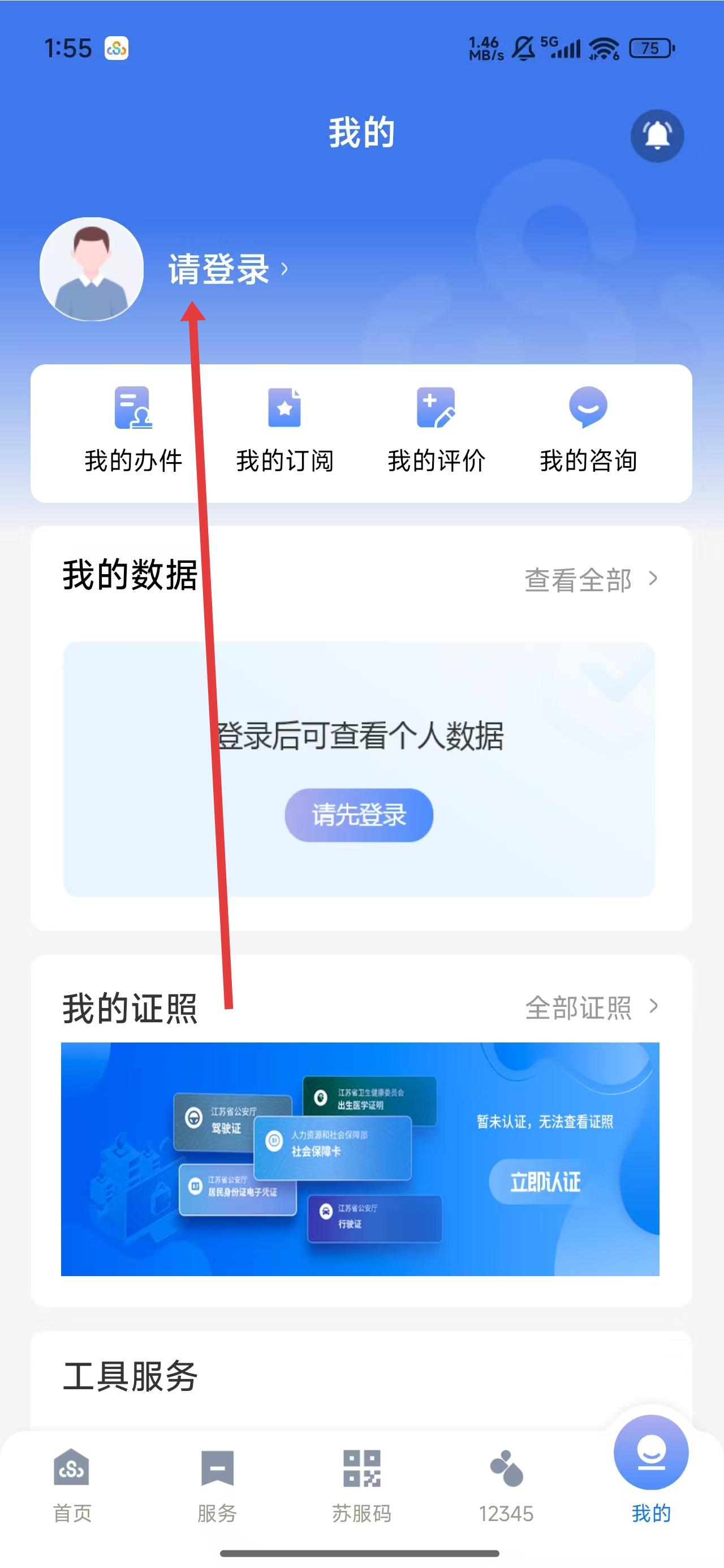 1、進(jìn)入到蘇服辦首頁(yè)中,可以點(diǎn)擊下方我的按鈕,進(jìn)入到我的主頁(yè)。