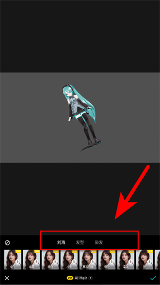 3、在AI發(fā)型編輯頁面,選擇劉海、發(fā)型、染發(fā)等分類,挑選喜歡的發(fā)型樣式。