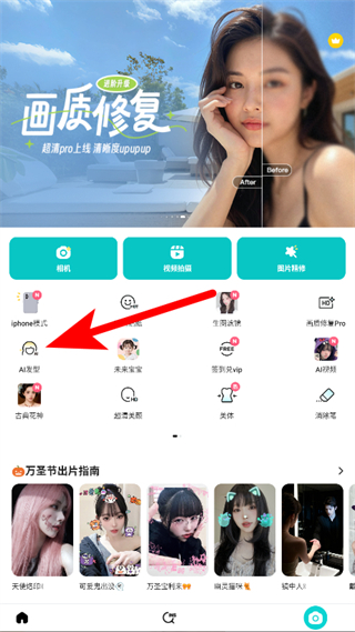 1、打開b612咔嘰APP,點擊AI發(fā)型功能入口,進(jìn)入功能選擇頁面。