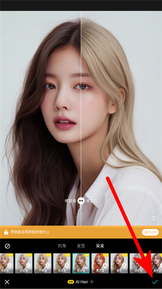 4、選擇好發(fā)型后,點擊右下角確認(rèn)按鈕,即可將所選發(fā)型效果應(yīng)用到照片上。