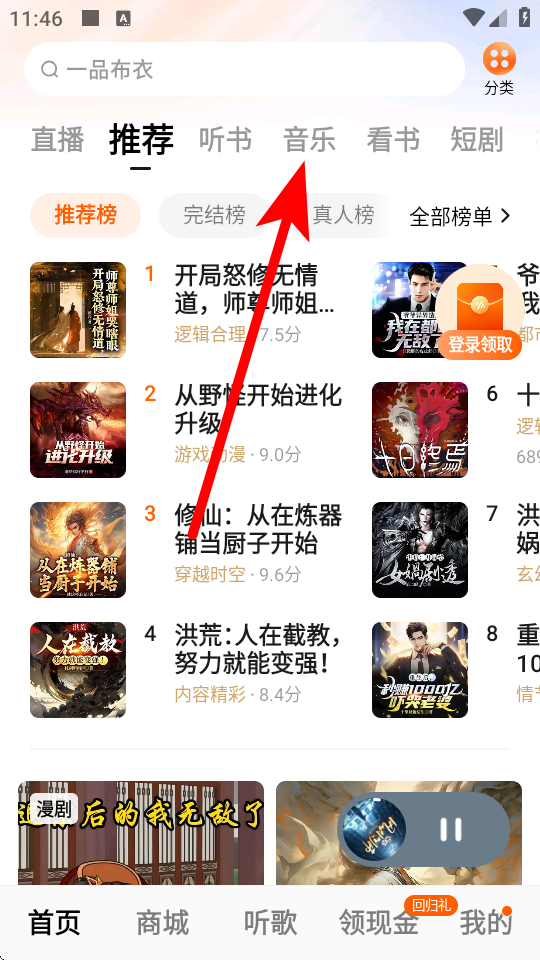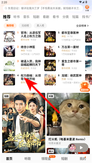 2、搜索完成后,在結(jié)果列表里定位到目標(biāo)內(nèi)容如前女友母親懷上雙胞胎,她急哭了,瀏覽聽書榜、音樂榜等分類下的相關(guān)推薦。