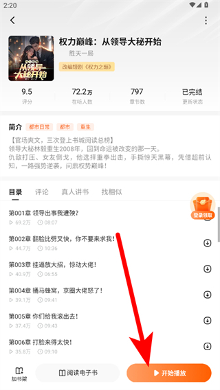 2、在小說詳情頁面,點擊開始播放按鈕,進入聽書播放頁面。