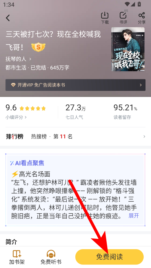 2、在小說(shuō)書(shū)籍詳情頁(yè)面,點(diǎn)擊免費(fèi)閱讀按鈕,進(jìn)入小說(shuō)閱讀界面。