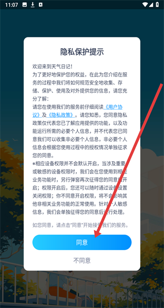 1、在天氣日記的“隱私保護(hù)提示”彈窗點(diǎn)擊“同意”,進(jìn)入天氣日記主界面。