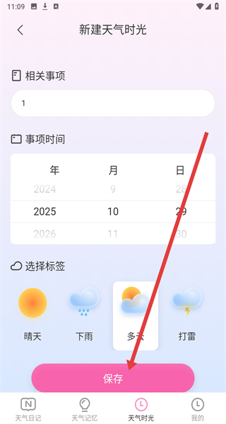 4、在新建天氣時(shí)光界面填寫(xiě)相關(guān)事項(xiàng)、選擇事項(xiàng)時(shí)間和天氣標(biāo)簽后,點(diǎn)擊“保存”,完成天氣時(shí)光記錄創(chuàng)建。
