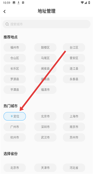2、在地址管理頁面點擊“定位”,獲取當前位置福州天氣。