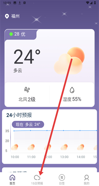 3、在福州天氣頁面點擊底部“15日預報”,進入15日預報界面。