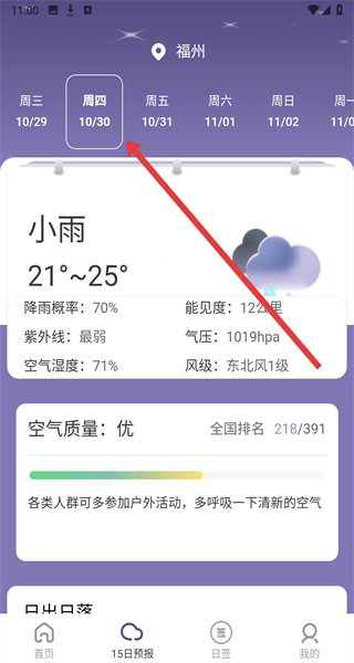4、在15日預報界面點擊“周四10/30”,查看福州市10月30日的詳細天氣信息,包括溫度、天氣狀況、降雨概率等。