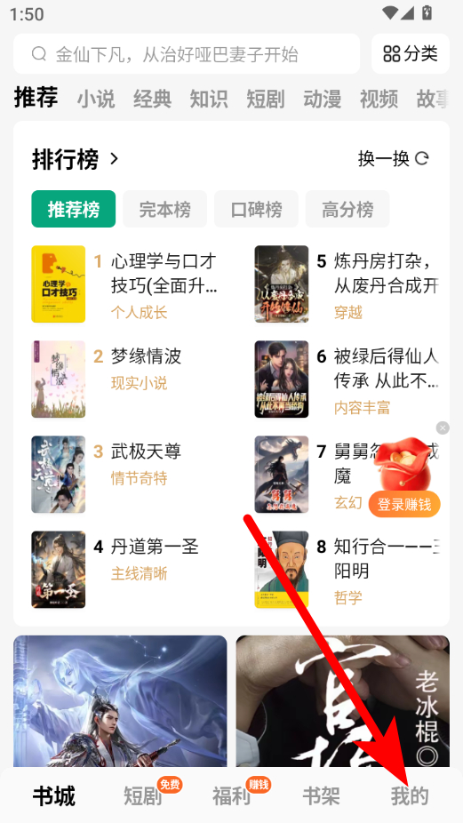 2、可瀏覽推薦榜、完本榜等榜單,或直接搜索想聽的小說,點擊對應(yīng)小說封面,進入小說聽書詳情頁。