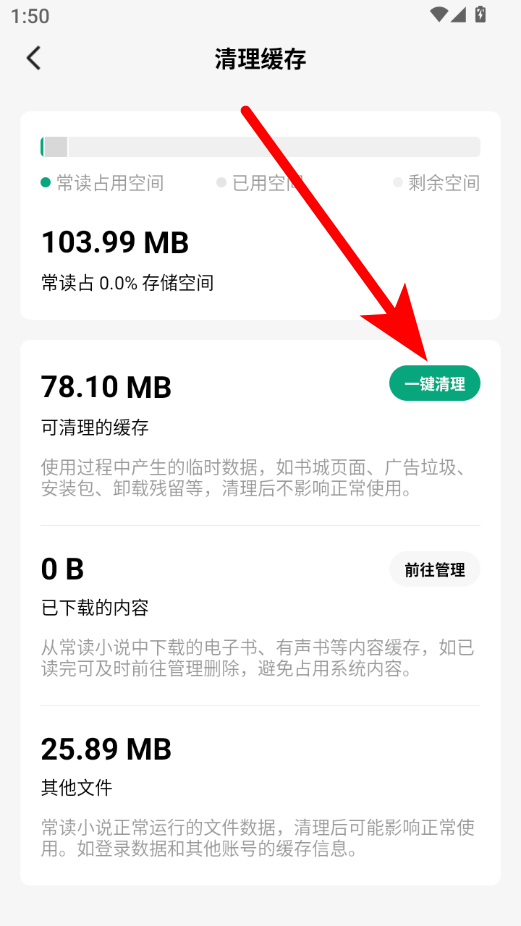 4、點擊一鍵清理按鈕,即可清理可清理的緩存數(shù)據(jù),釋放內(nèi)存空間。