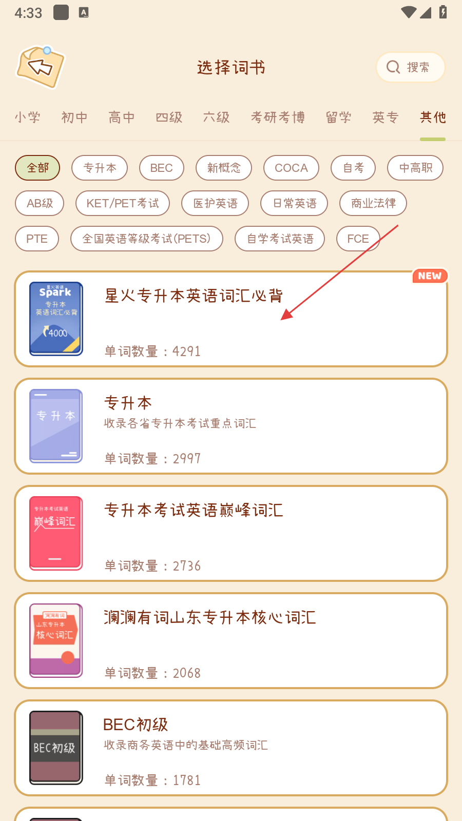 1、打開奶酪單詞APP,在選擇詞書頁面,根據(jù)學(xué)習(xí)需求,挑選對(duì)應(yīng)的詞書。