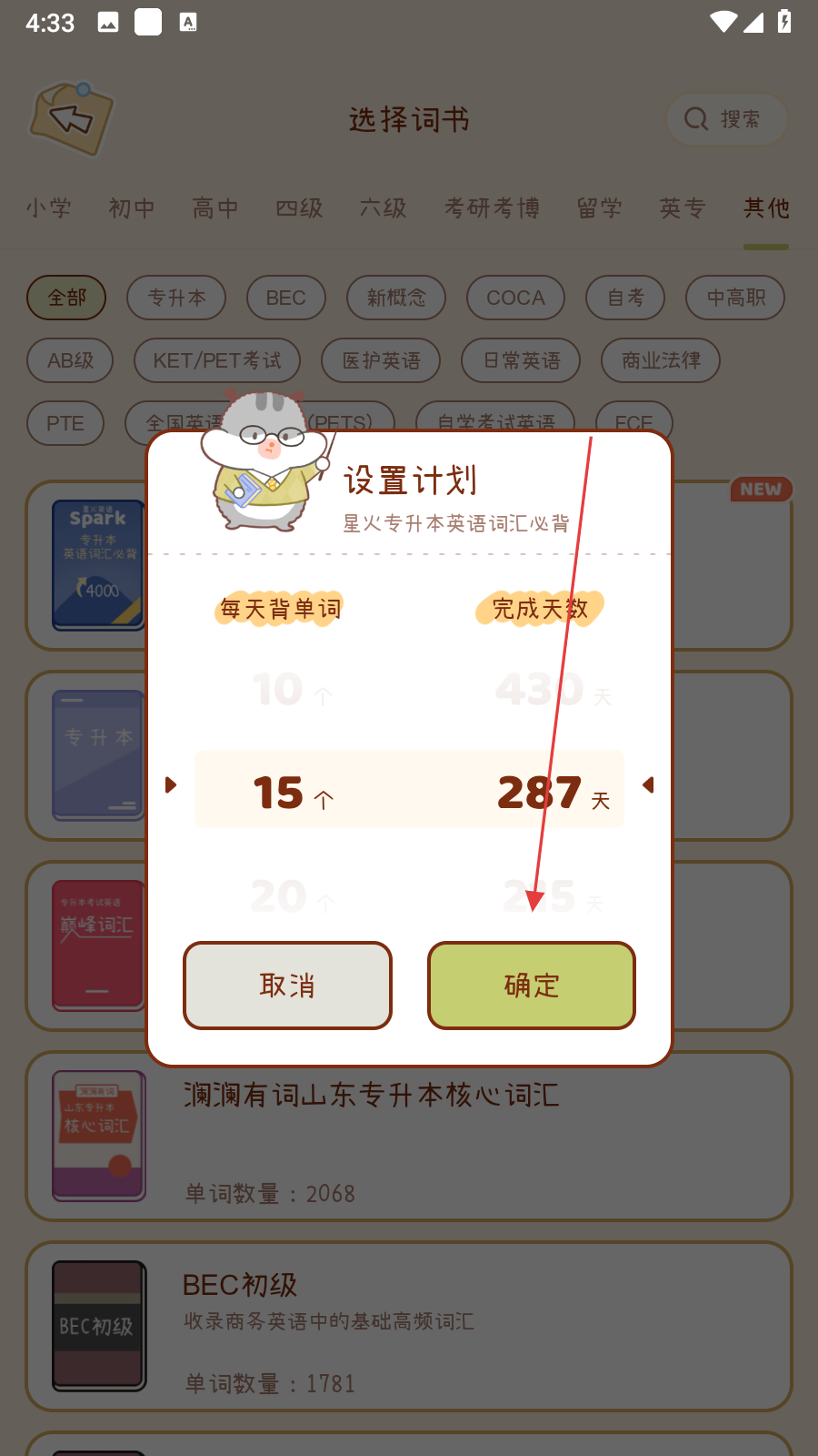 2、點(diǎn)擊選中的詞書后,在彈出的設(shè)置計(jì)劃窗口,設(shè)置每天背單詞的數(shù)量與預(yù)計(jì)完成天數(shù),點(diǎn)擊確定。