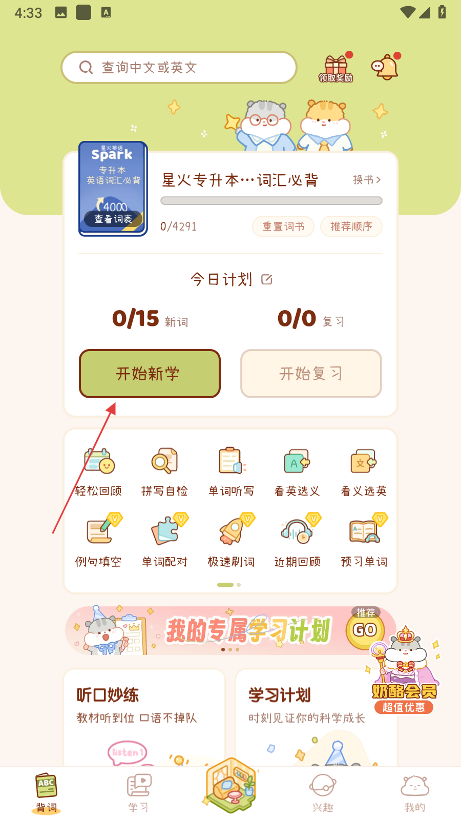 3、進(jìn)入學(xué)習(xí)主界面,點(diǎn)擊開始新學(xué)按鈕,進(jìn)入單詞學(xué)習(xí)頁面。