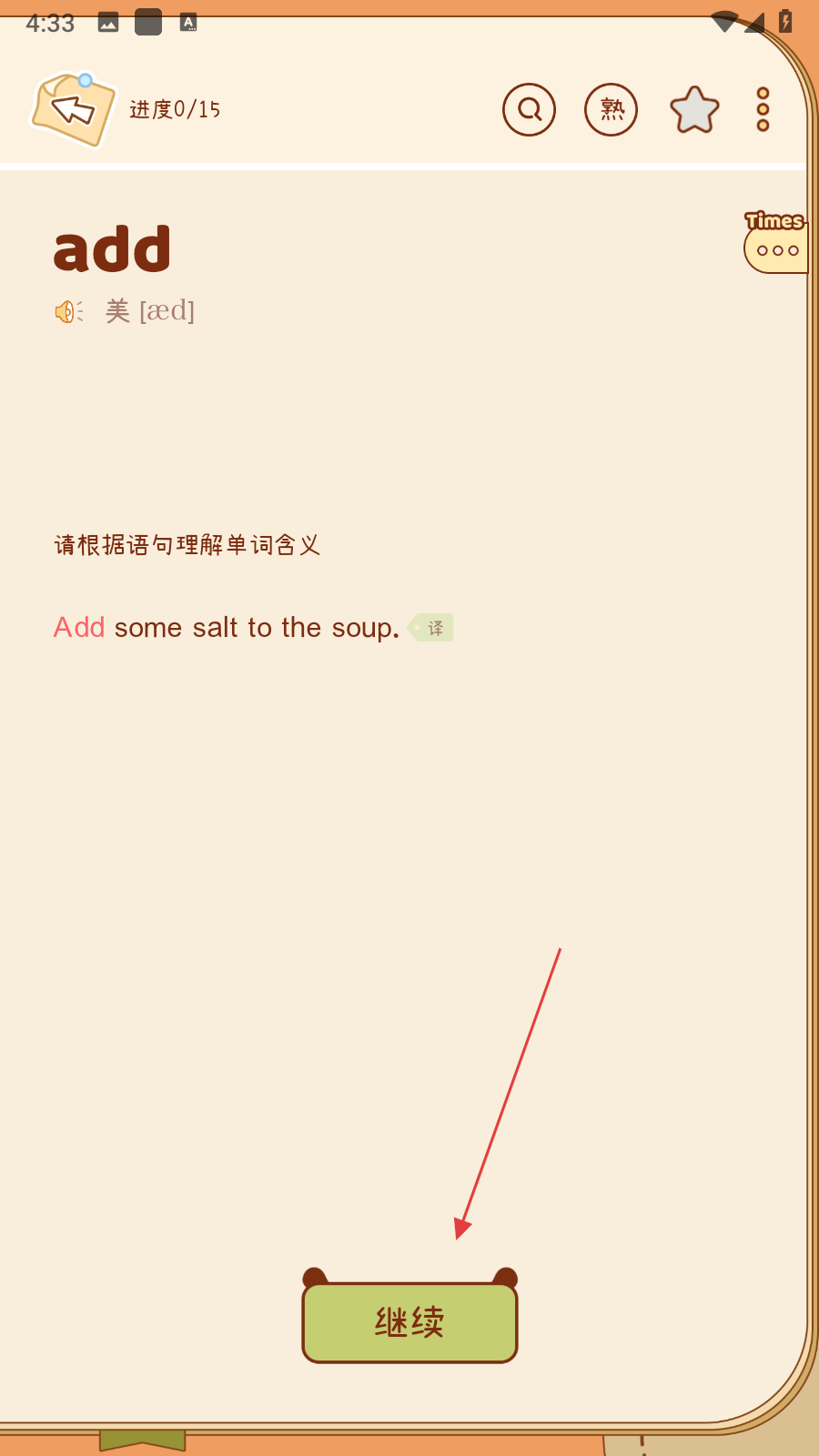 4、完成當(dāng)前單詞學(xué)習(xí)后,點(diǎn)擊繼續(xù)按鈕,依次學(xué)習(xí)當(dāng)日計(jì)劃內(nèi)的所有新詞。