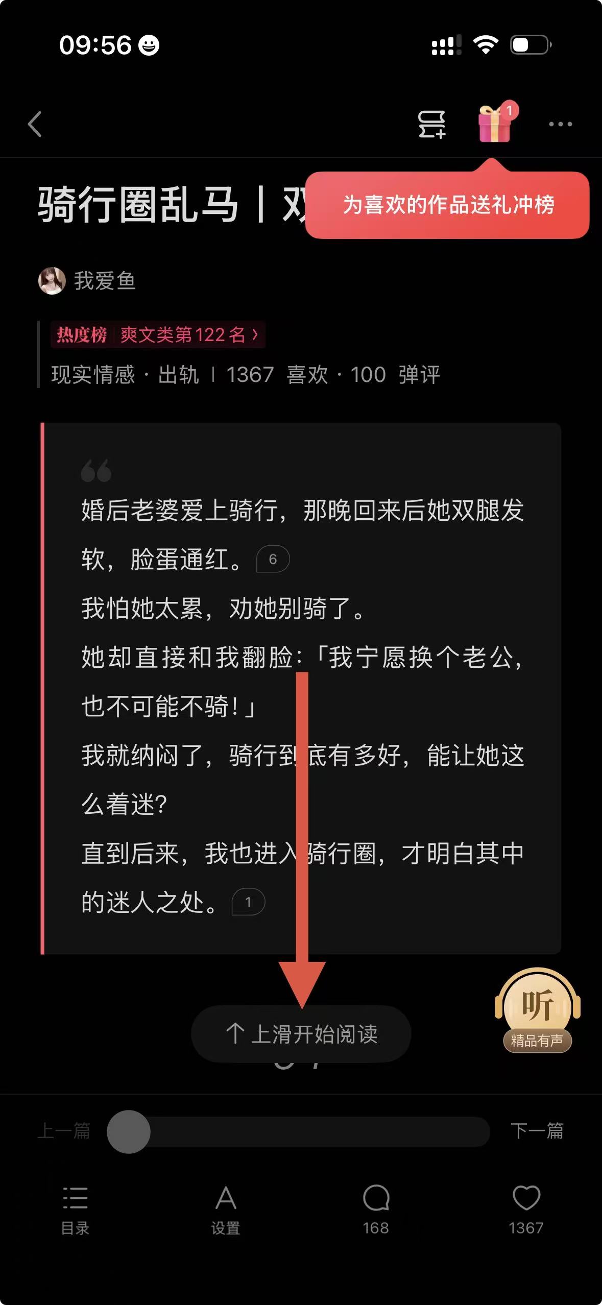 2、在小說閱讀界面,上滑開始閱讀,進(jìn)入小說內(nèi)容頁面。