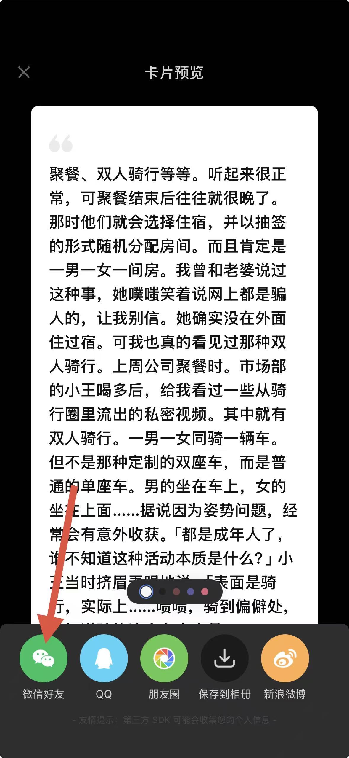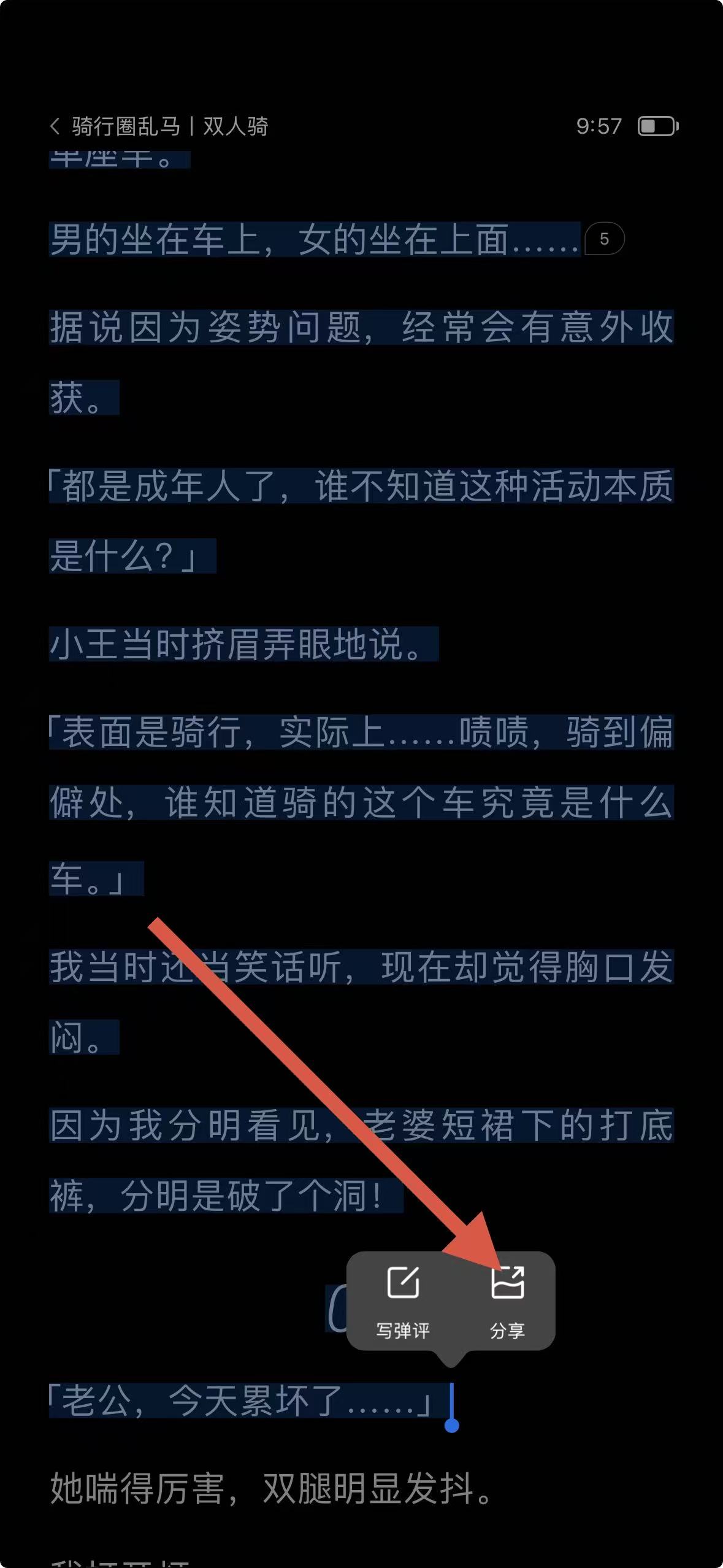 3、在小說內(nèi)容頁面,點(diǎn)擊長按全選復(fù)制文字內(nèi)容,點(diǎn)擊分享選項(xiàng),進(jìn)入分享界面。