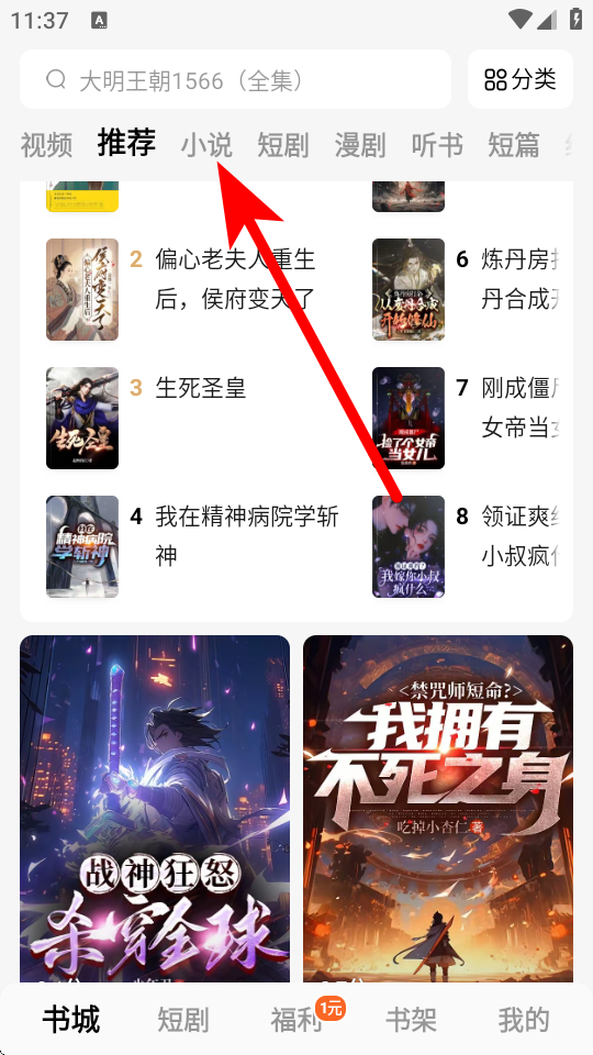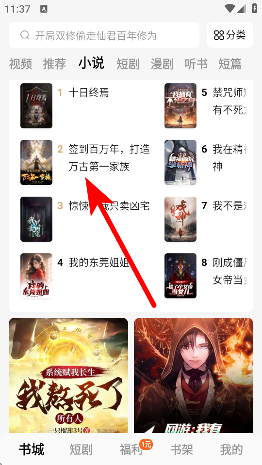 2、在小說頻道頁面,點(diǎn)擊要查看的小說,進(jìn)入小說詳情界面。