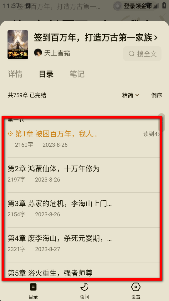 5、彈出目錄列表,即可查看小說的章節(jié)目錄,完成目錄查看操作。