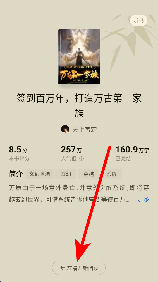 3、在小說詳情界面,點(diǎn)擊左滑開始閱讀按鈕,進(jìn)入小說閱讀界面。
