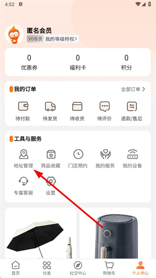 2、在個(gè)人頁面中,點(diǎn)擊地址管理選項(xiàng)。