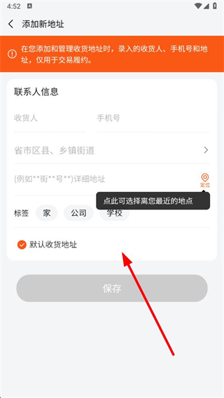 4、在添加新地址頁面,填寫聯(lián)系人信息、地址等內(nèi)容后點(diǎn)擊保存即可添加新地址信息。