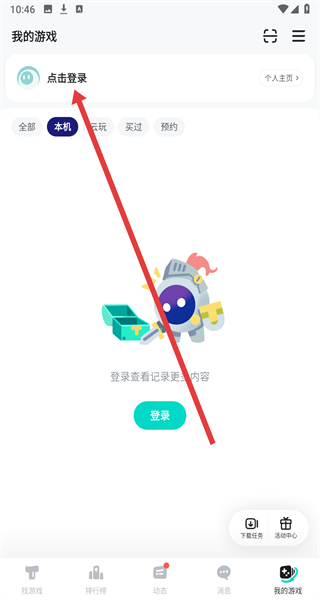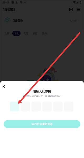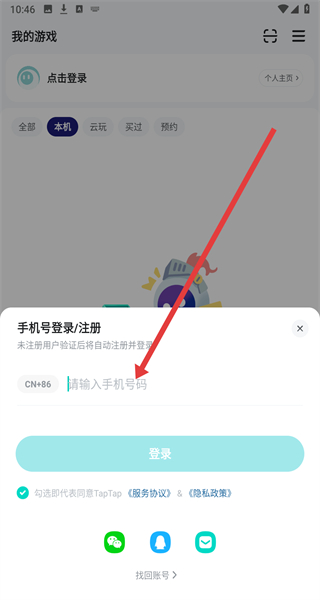 2、在“我的游戲”頁面點擊“點擊登錄”,進入手機號登錄/注冊界面。