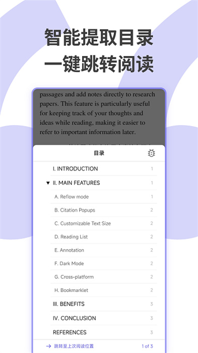 3、閱讀模式:專(zhuān)業(yè)的閱讀界面,可提高閱讀效率,并提供注釋和批注功能;