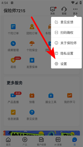 1、打開保險師APP我的頁面,點擊右上角更多,展開功能菜單。