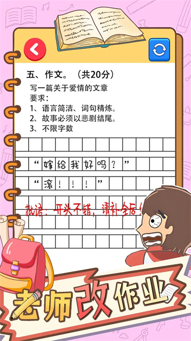 老師改作業(yè)是一款休閑主題的錯題改正類游戲,玩家將需要扮演一個語文老師,在游戲中通過批改不同的語文試卷并找出錯誤,以順利通關關卡,游戲的試卷和劇情設計,可以讓玩家在愉快的游戲過程中學習和提高語文水平,此外,對于語文學習者來說,這款游戲不僅是一種愉快的娛樂方式,更可以提高他們的語文水平。