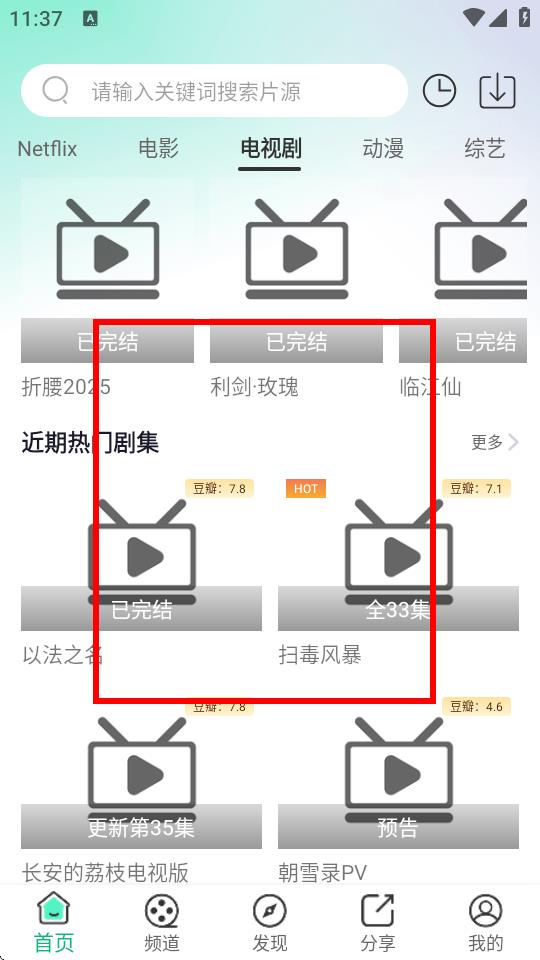 2、進(jìn)入電視劇界面,瀏覽并選擇你感興趣的電視劇,比如以法之名、掃毒風(fēng)暴等。