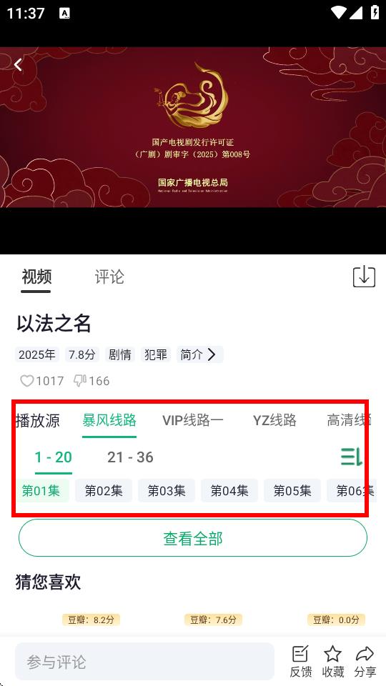 3、點(diǎn)擊選中的電視劇,進(jìn)入詳情頁,在播放源處選擇合適的播放線路并點(diǎn)擊相應(yīng)集數(shù)。