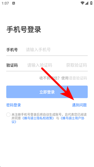 1、打開(kāi)蜂鳥(niǎo)騎士APP,需要在手機(jī)號(hào)登錄界面點(diǎn)擊遇到問(wèn)題。