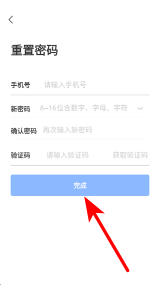 3、進(jìn)入重置密碼頁(yè)面后,依次輸入信息后點(diǎn)擊完成,即可完成密碼重置。