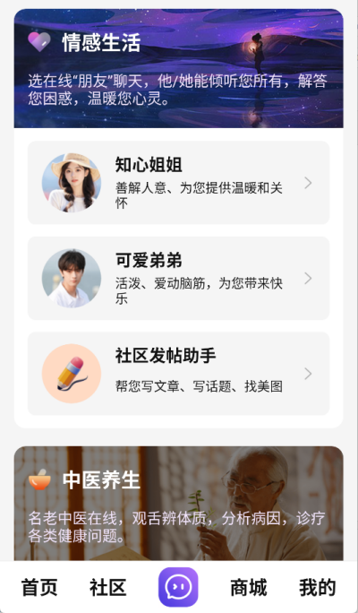 4、點(diǎn)擊中間的情感交流選項(xiàng),可以在里面與更多的網(wǎng)友在線聊天,能夠讓ta傾聽你的煩惱,在里面有多個傾訴對象類型可以選擇;