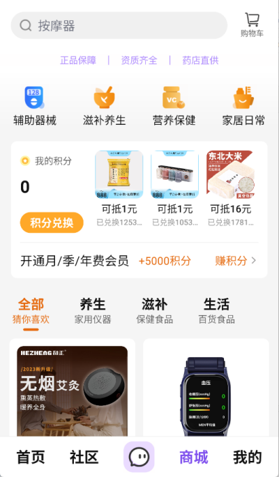 3、點(diǎn)擊商城界面,可以在里面購買許多的醫(yī)療器械等內(nèi)容,選擇自己感興趣的輔助器械進(jìn)行選購,還可以使用積分兌換各種家用物品;