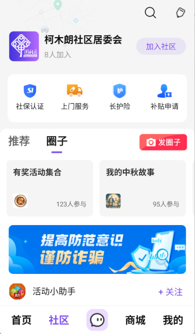 2、點(diǎn)擊下方的社區(qū)選項(xiàng),在里面擁有更多的社區(qū)服務(wù)功能可以查看,可以自己選擇相應(yīng)的居委會加入其中,提供更加精準(zhǔn)的生活服務(wù)內(nèi)容;