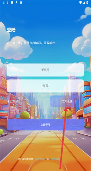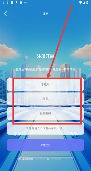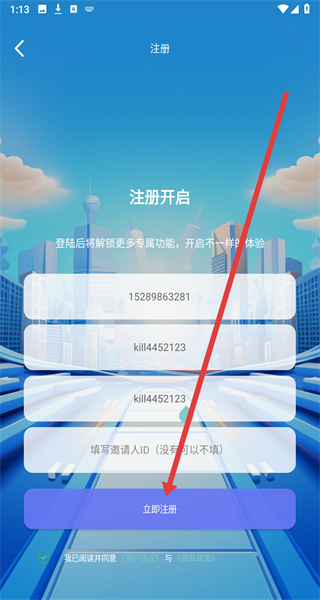4、在填寫好手機(jī)號和密碼信息后,點(diǎn)擊立即注冊按鈕,完成注冊賬號。
