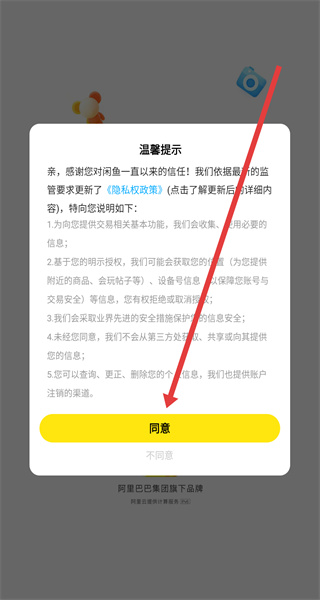 1、在打開閑魚后,點擊同意按鈕,同意隱私權(quán)政策后進入首頁。