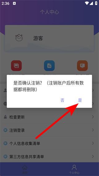 3、在彈出的確認注銷提示框中,點擊是按鈕,即可完成賬號注銷操作。
