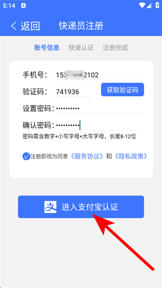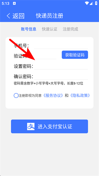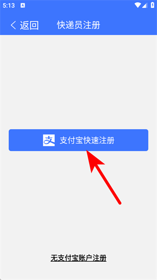2、在快遞員注冊(cè)界面點(diǎn)擊支付寶快速注冊(cè),進(jìn)入賬號(hào)信息填寫頁(yè)面。