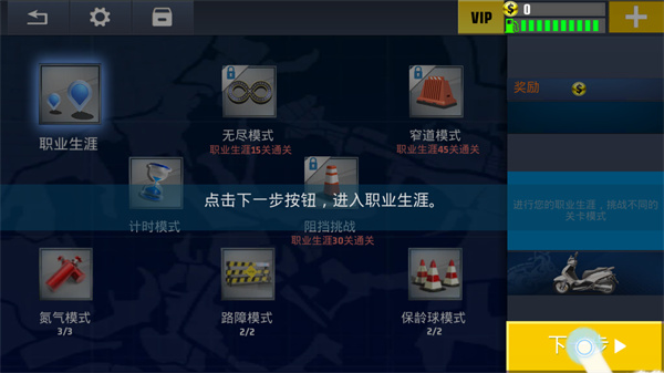 3、然后會進(jìn)入到一個游戲模式選擇界面,但是我們屬于新手,就需要從最初的職業(yè)生涯開始練習(xí)上手,點擊【下一步】開啟比賽;