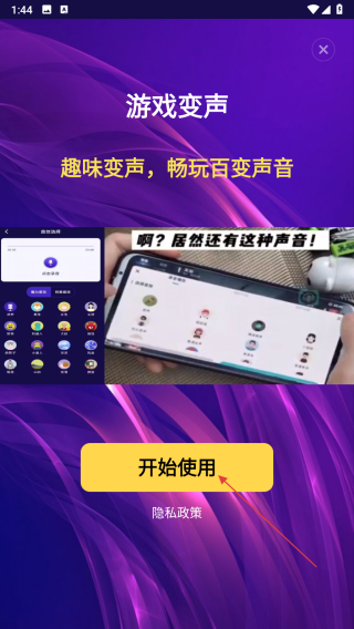 1、打開游戲變聲器應(yīng)用,點(diǎn)擊黃色開始使用按鈕,進(jìn)入后續(xù)功能頁面。