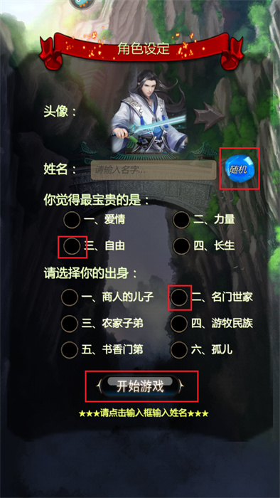 2、此時玩家將需要進行角色的選擇,可以給自己的角色進行名字以及屬性等的選擇,并點擊【開始游戲】;