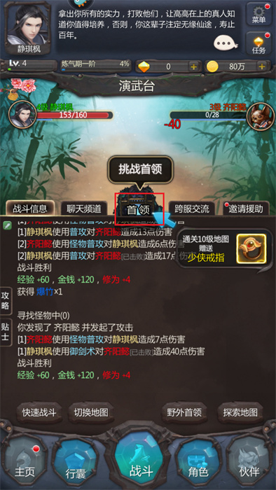 4、還可以點擊屏幕中央的【首領(lǐng)】按鈕,以快速的和這些首領(lǐng)們進行戰(zhàn)斗競技;