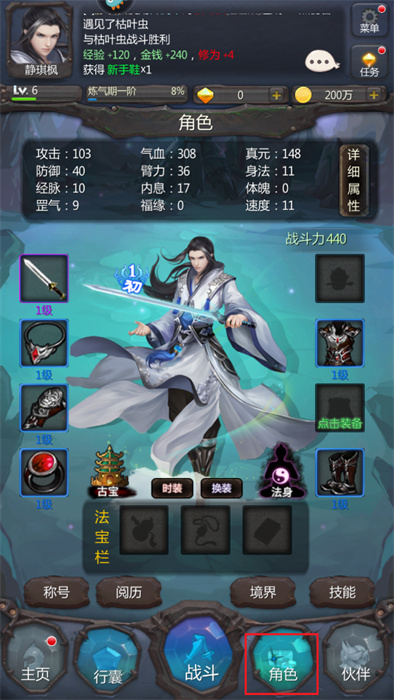 5、點擊屏幕下方的【角色】按鈕來進行角色相關(guān)信息的查看,不同的角色有著不同的屬性;