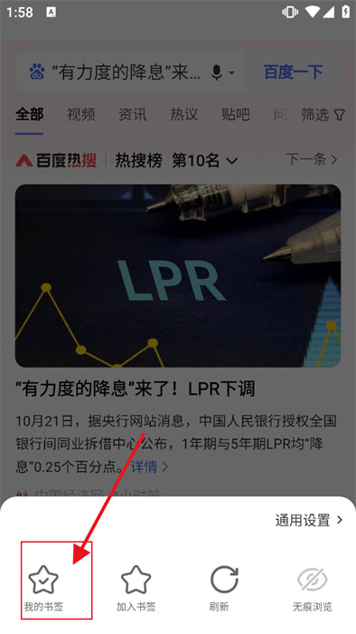 4、如果你對于當(dāng)前網(wǎng)頁十分的感興趣,點(diǎn)擊右下角【菜單】并添加到書簽當(dāng)中,這樣隨時都能點(diǎn)擊查看。