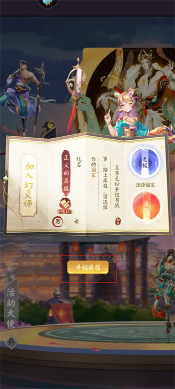 3、選擇男或者女,然后點擊選擇想要加入的國家,只有成為一個幻靈師召喚自己的武靈英雄【開始旅程】為自己的國家奮勇前進抵御作戰(zhàn);